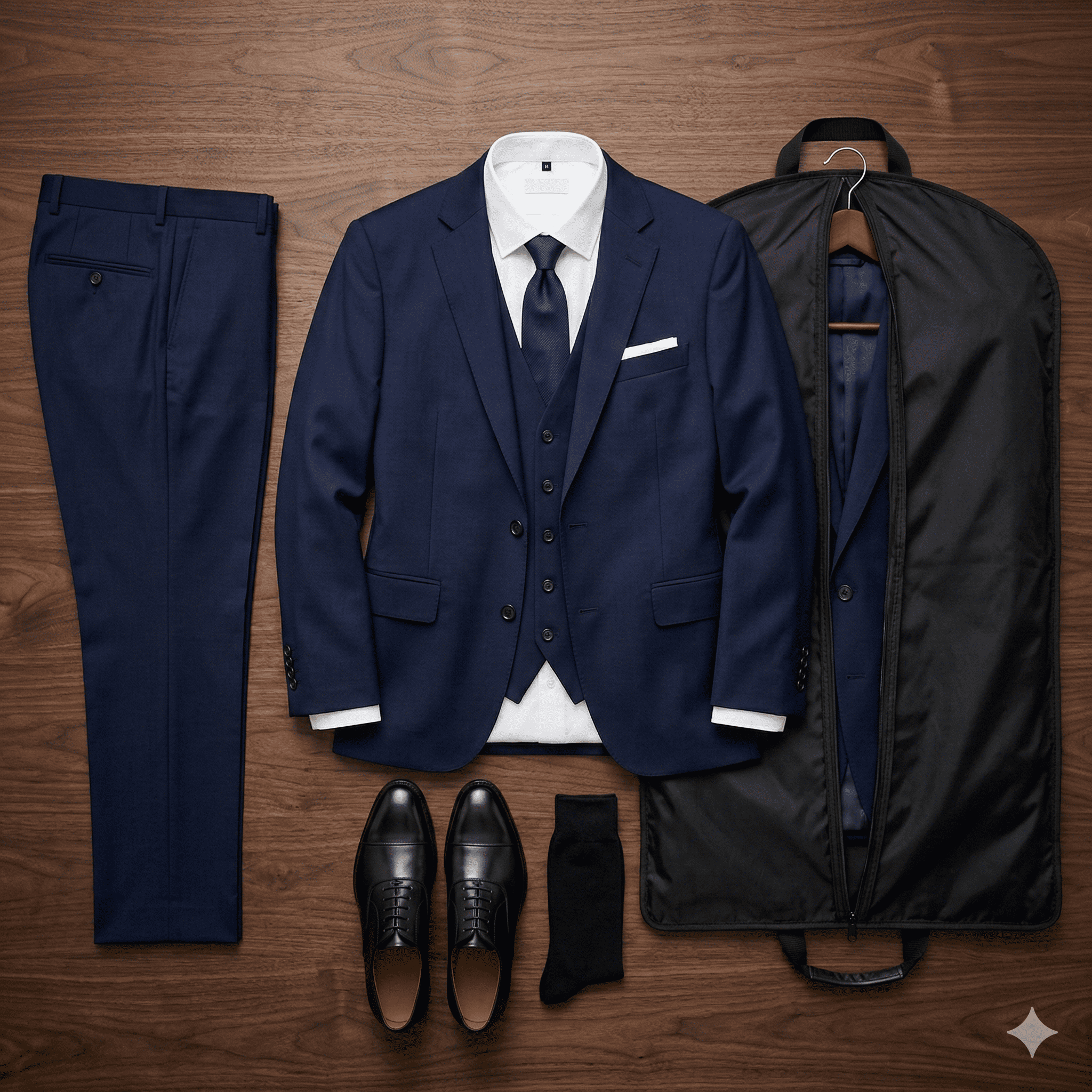 Accesorios adicionales como reloj, pañuelo, cartera, etc. pueden realzar aún más el atuendo.